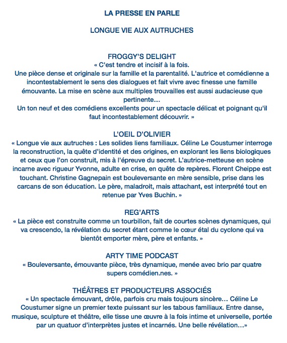 Nos partenaires de création : Espace Sorano, Vincennes (94) – Théâtre des Roches, Montreuil (93), Anis Gras, le lieu de l’autre, Arcueil (94) – SACD, Paris (75), Les Tréteaux de France, CDN itinérant, Aubervilliers (93)